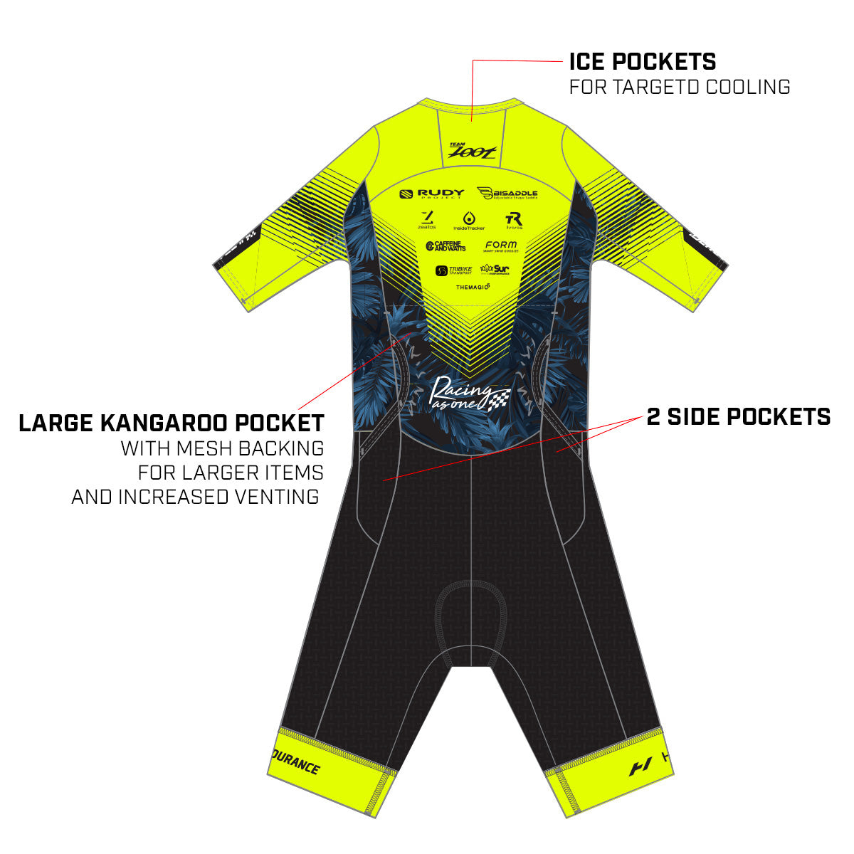 Designed with internal, strategically placed ice and cold sponge storage pockets in the suit to help keep your core temperature down. A Zoot innovation. - EXTREME BREATHABILITY AND SUN PROTECTION FOR THE ENTIRE RACE